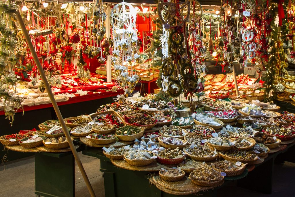Dans de nombreuses villes de France, des marchés de Noël s’installent au mois de décembre, dans les rues ou sur les places. Ce sont souvent de petits chalets en bois alignés où l’on vend des décorations de noël et des objets à des offrir pour les fêtes (décorations personnalisées, jeux, écharpes, bonnets, bouillottes, …).